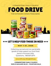 Cornerstone Family Church is collecting canned goods for Extended Hands Food Bank during the month of May. You may drop off your donations Sunday through Wednesday from 9am to Noon.