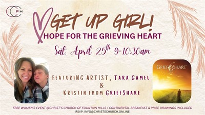 Ladies are invited to the next Get Up Girl Women's Ministry Meet Up on April 25th at 9am at CCFH, titled: "Hope for the Grieving Heart." Artist & Worship Leader, Tara Gamel will be sharing her heartbreaking, but hopeful story about the recent loss of her son. In addition, Kristin Whitchurch from GriefShare will talk about the resources and help available to those suffering from the loss of a loved one. This is a FREE event, with a free continental breakfast and prize drawings. Invite a friend. You don't want to miss it!